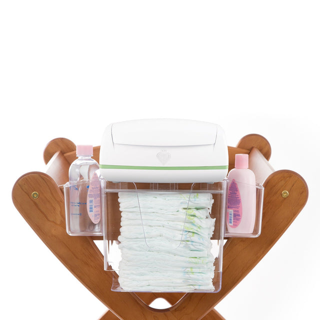 Do you know where everything is in your nursery? Would you be able to find what you need in the dark, at 3am? With a new baby, life can become a little chaotic. Control what you can and keep your diaper changing and nursery essentials at the ready with Prince Lionheart's Diaper Depot. This tried and true diapering supply organizer was the first of its kind - harking back to 1973 when our family first started Prince Lionheart in our grandparents' garage. Today, the clear Diaper Depot remains a family favorite for its ability to blend with any nursery decor, not to mention the fact it takes up space otherwise unused - air - as it hangs from a changing table. This sanity saver organizes chaos and makes life with baby a little less hectic by having everything in its place, at the ready, day or night. Designed with safety in mind, the Diaper Depot can be easily accessed with one hand while you keep one hand on your baby during diaper changes. The main compartment holds up to 18 large diapers, the top tray can hold your favorite Prince Lionheart Wipes Warmer or package of baby wipes, and two removable side bins can hold nail clippers, mucus bulbs, ointments, creams, combs and more. Proudly MADE IN THE USA and free from Phthalates, Lead and BPA.