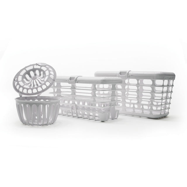 This COMBO will save you time, hassle, and potential mold issues—chuck all of the small feeding parts in the baskets and let your dishwasher do the work. The addition of the Valve CLEANER is ideal for those who are a little remiss when it comes to cleaning those hard to wash sippy cup valves. If you can relate, then it's best to let the valve CLEANER do the work as it shakes all of that caked on (and often moldy) milk and juice right off, allowing thorough sanitization. The BASKETS keep everything contained so you don't have to perform search and rescue operations at the end of a load. One set will last you a lifetime. Doesn't get much better than that.